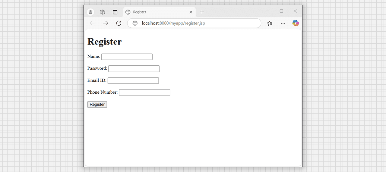 </web-app>register.jsp: Handles user registration.login.jsp: Handles user login.RegisterServlet.java: Processes registration from submission.LoginServlet.java: Processes login form submission.web.xml: Servlet mapping configuration.